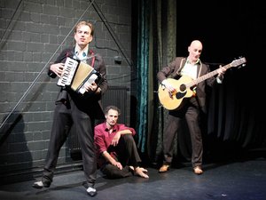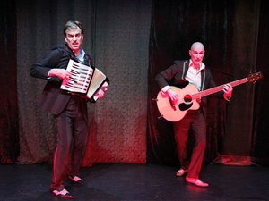 Sie sind als geschniegelte und gestriegelte, pomadierte und gepuderte Moritatensänger mit Akkordeon und Gitarre sowie in zahlreichen weiteren Rollen die eigentlichen Stars des Abends;